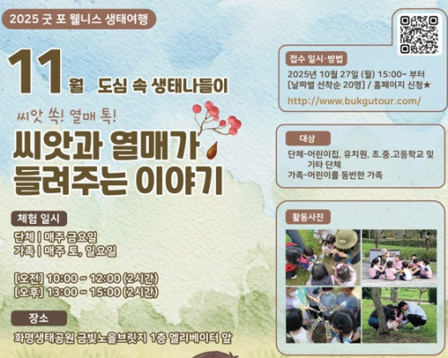 씨앗 쏙! 열매 톡! 씨앗과 열매가 들려주는 이야기 (체험비) 1인당 3,000원(경남은행 207-0046-6885-04 곽*국 굿포 웰니스 생태여행)